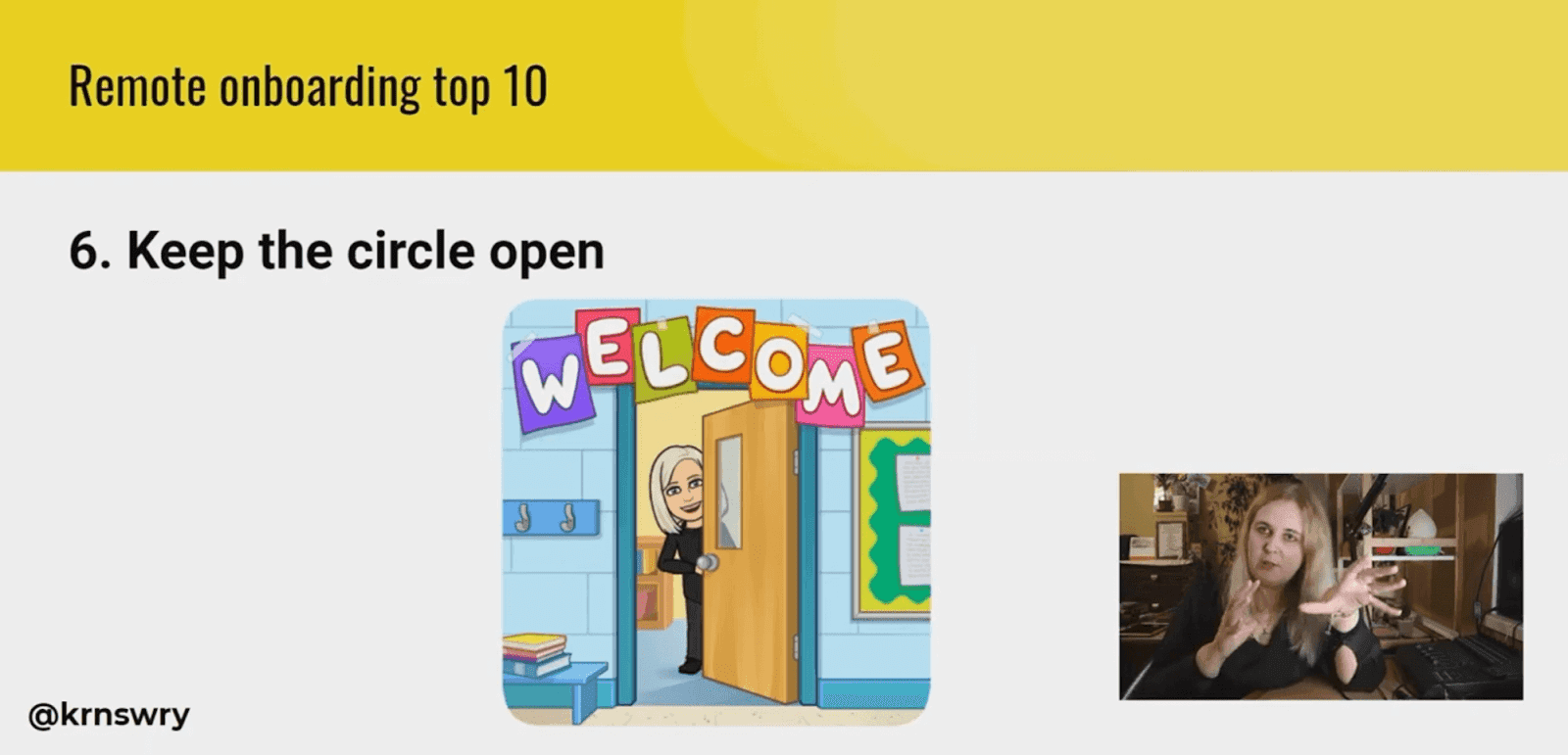 You can achieve that by inviting the new hire to shared work and non-work spaces, or as Sawrey calls it, by “keeping the circle open”.