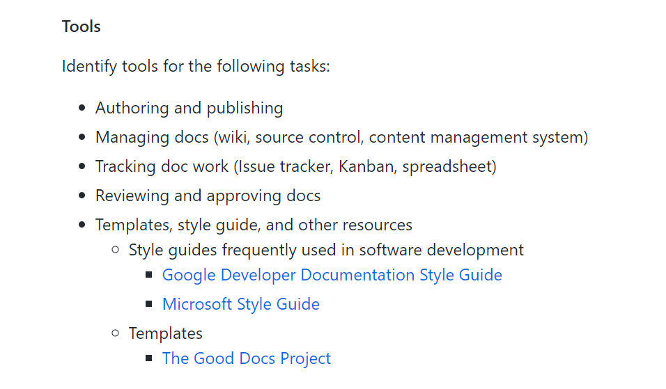 For instance, Google’s writer onboarding toolkit covers the tools the writer needs for authoring, publishing, and managing documents.