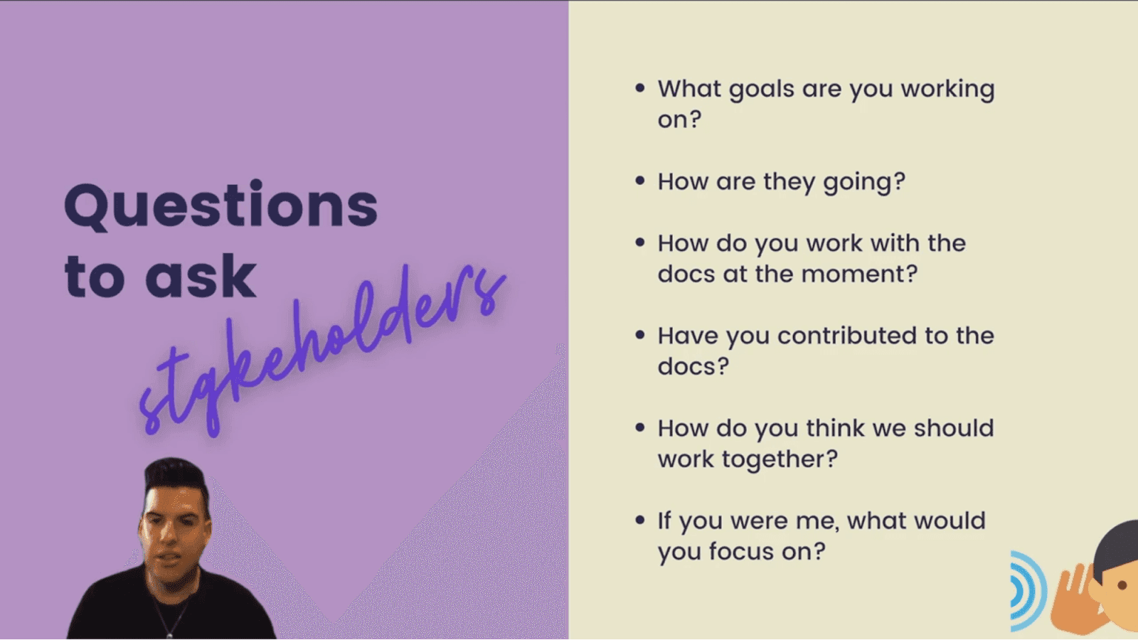 In the presentation he gave about the topic, Belton compiled a list of questions that writers can ask the team and the stakeholders, such as “How is the content organized?” and “What are the next projects?”