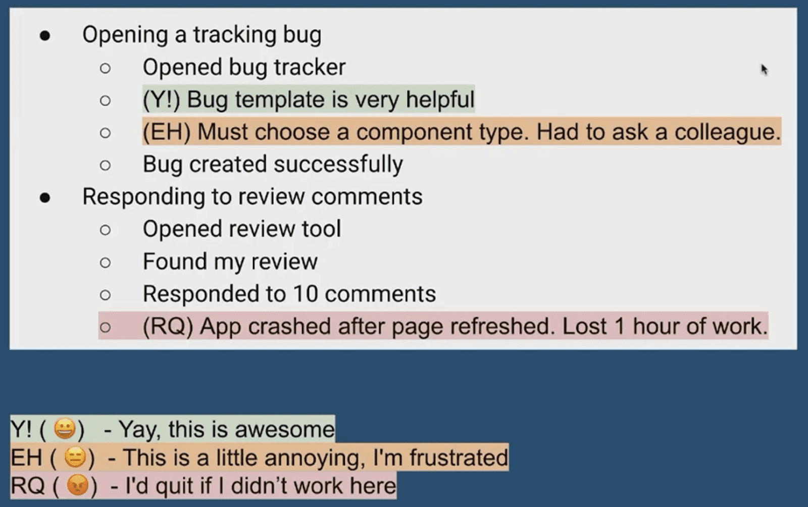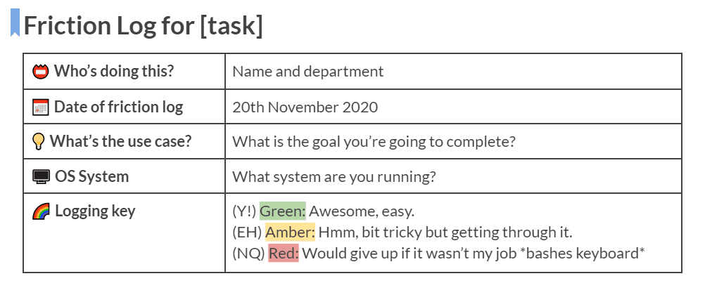 The image above shows an example of a friction log created by Google’s tech writer Nicola Yap.