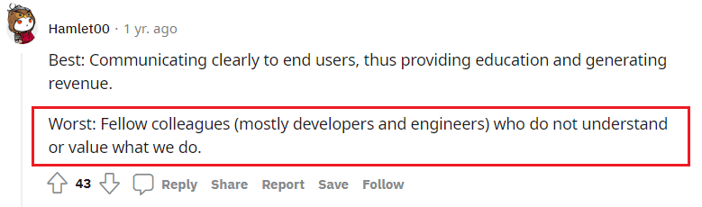 For instance, this tech writer took to Reddit to complain about their fellow colleagues not even understanding what writers do.