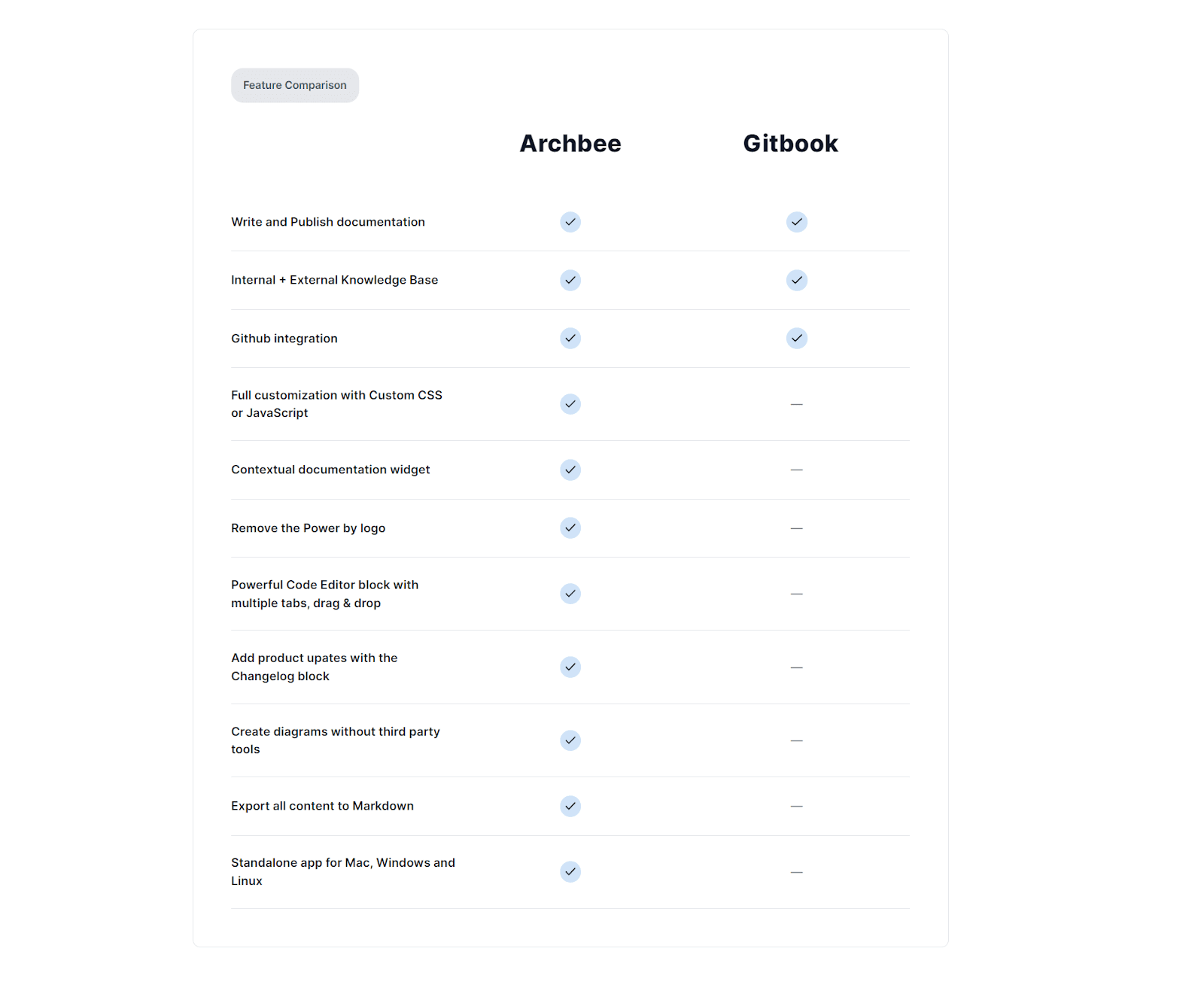 Here’s how we did that at Archbee. We offered comparisons of our product with the most popular tools in the documentation space.