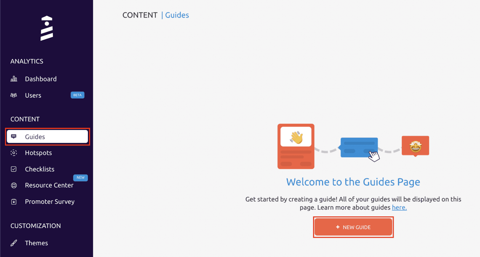 Tools like UserGuiding can help you create interactive guides and walkthroughs by enabling you to enrich your product’s interface with modals, tooltips, hotspots, and other elements that will support users as they interact with your software for the first time.