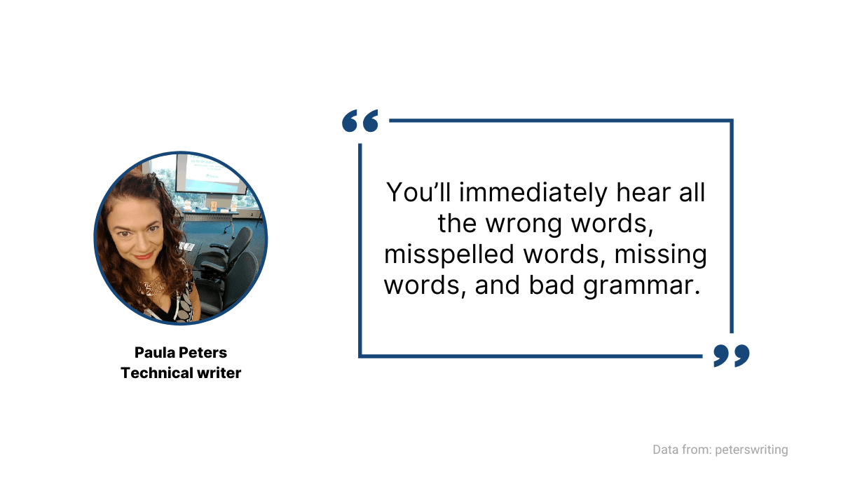 When you do that, you can catch errors, wrong sentence structure, and other undesirable elements in your writing, as Paula Peters, a long-time technical writer, puts it.