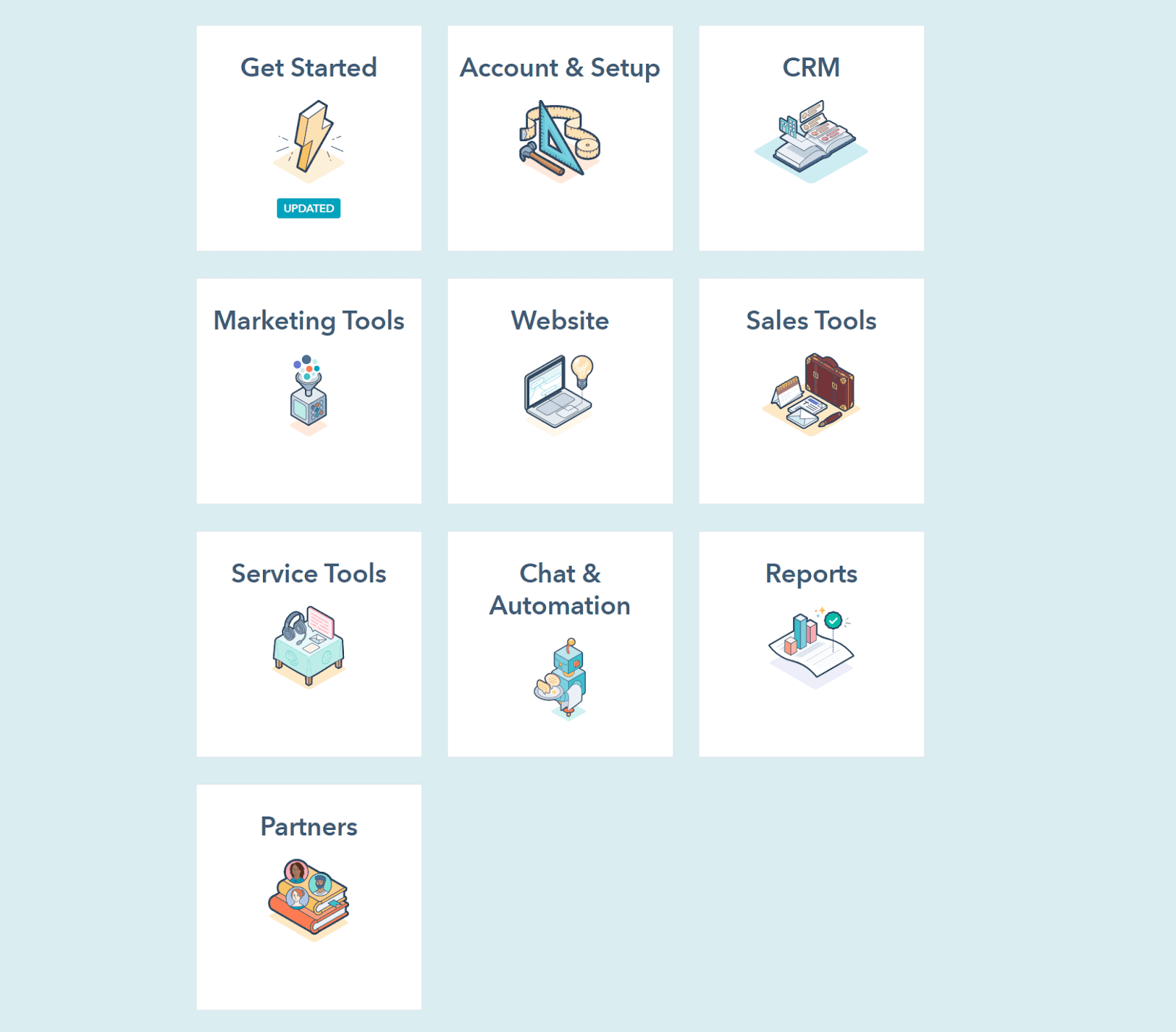The product (HubSpot’s CRM platform) is divided by topic according to the features it offers.