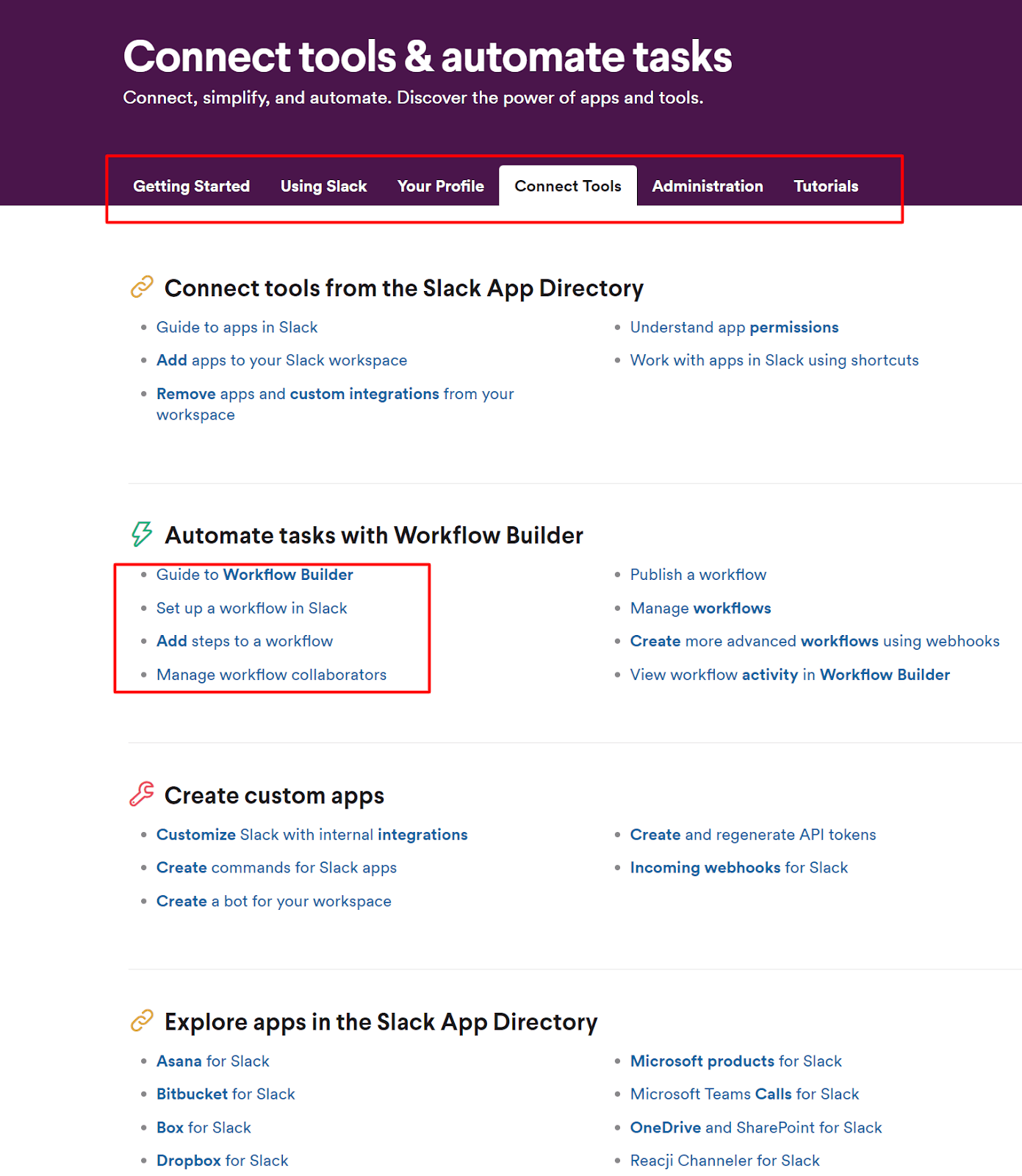 That way, the user won’t lose any time learning about a functionality that doesn’t interest them at that moment and they won’t become confused or make a wrong assumption, for example that workflows are somehow related to tool integrations within the app.