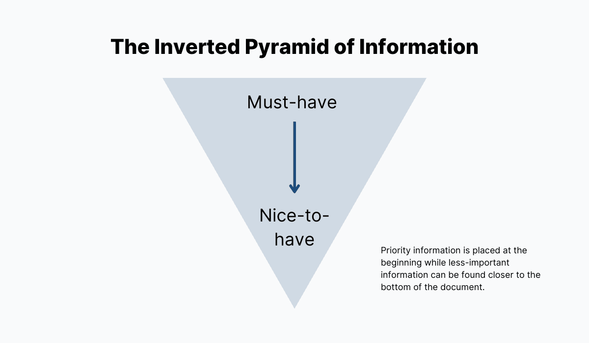 One more great practice to follow here is to always put the most important bits of information close to the top, while everything else can be included later on, as the document progresses towards the end.