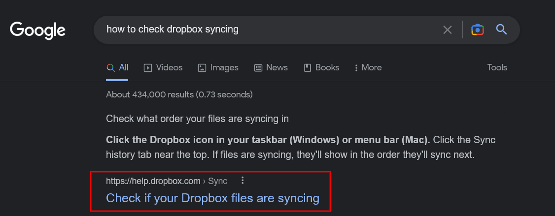 As you can see, the first result leads to the Dropbox product knowledge base. That means the company did an excellent job with SEO optimization.