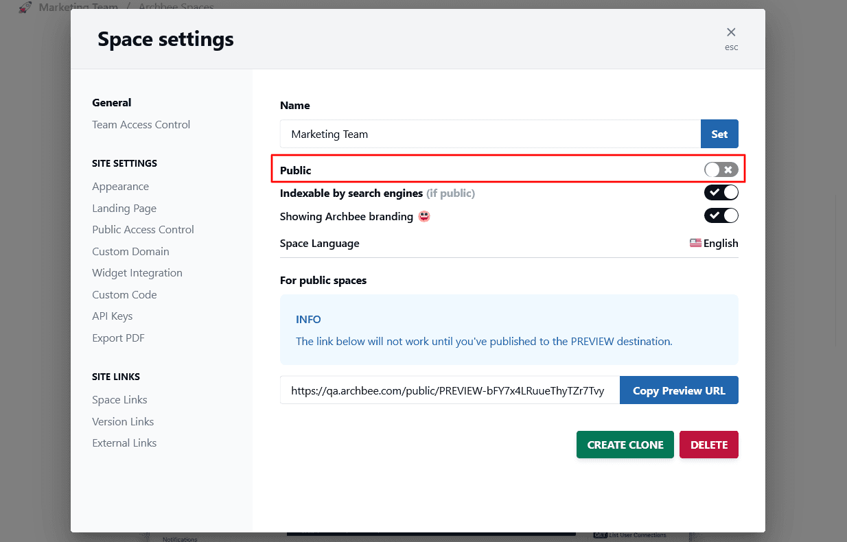 As you can see, this particular Space isn’t public, so the users won’t be able to find it, or any documentation in it, through search.