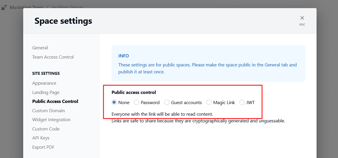 There are also Public access controls, which allow you to set who can access which parts of the documentation.