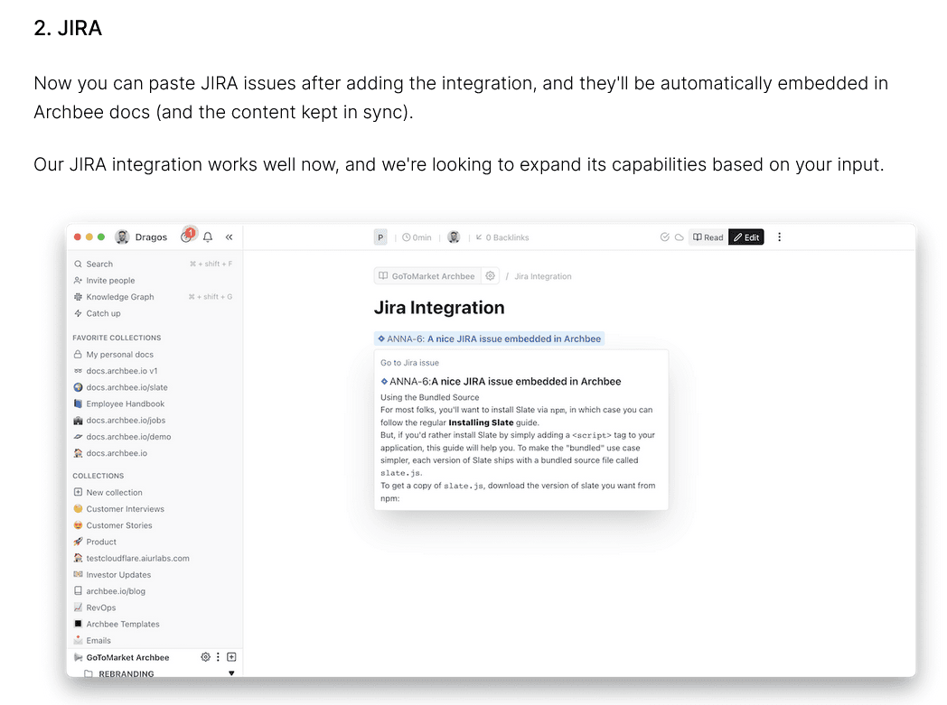 And if you need to find something specific in Archbee’s release notes, like information about the Jira integration, you can use the search bar located above the color labels.