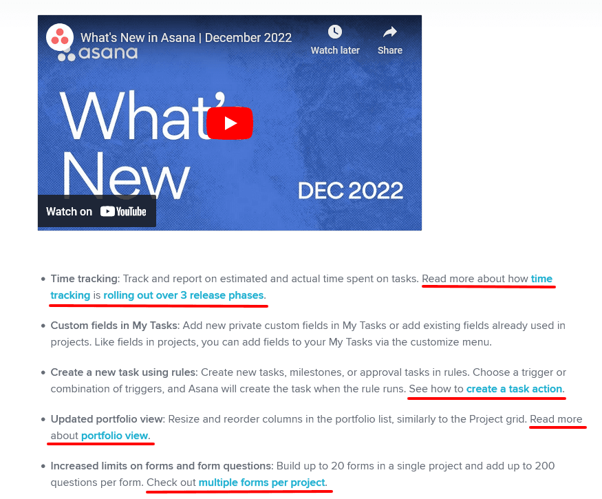 Of course, videos are just one part of Asana’s release notes. Below each video, they present changes in the form of a bulleted list, which includes links to relevant help articles.