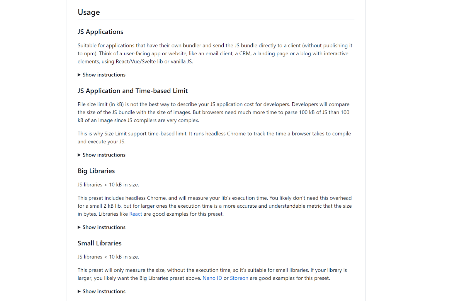 For example, have a look at how this README for a software project called Size Limit does a great job of explaining the use cases for this performance budget tool.