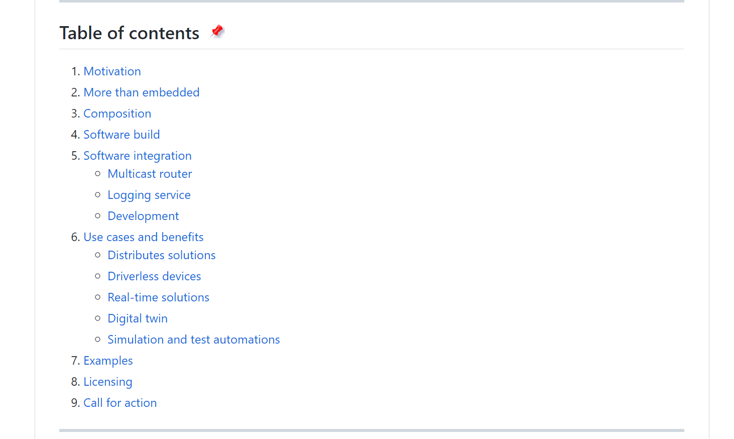 It’s a good idea to start things off with a table of contents, especially if your README is on the longer side.