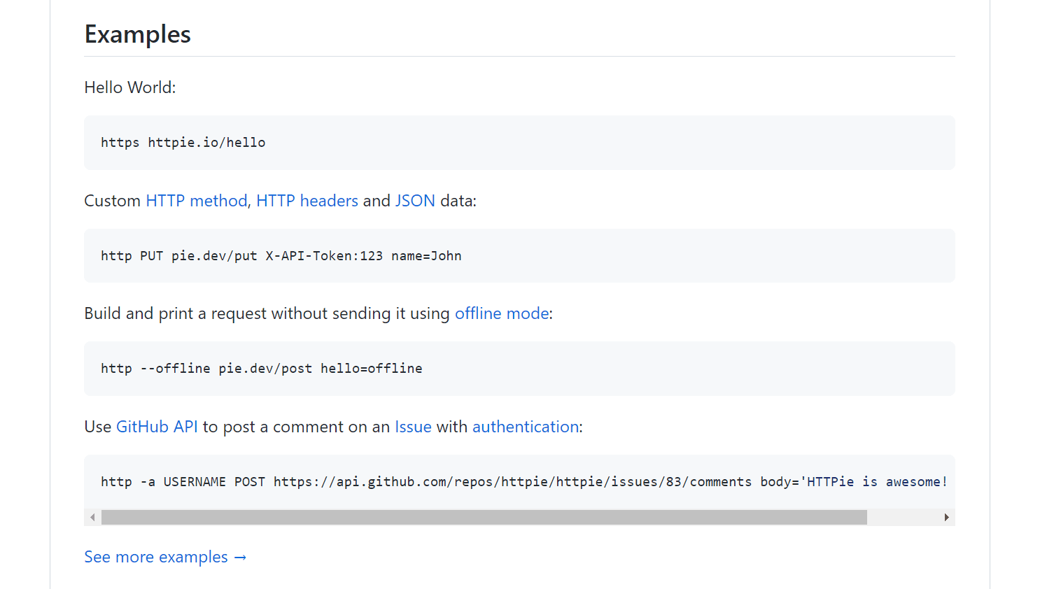 - Shows examples and common workflows