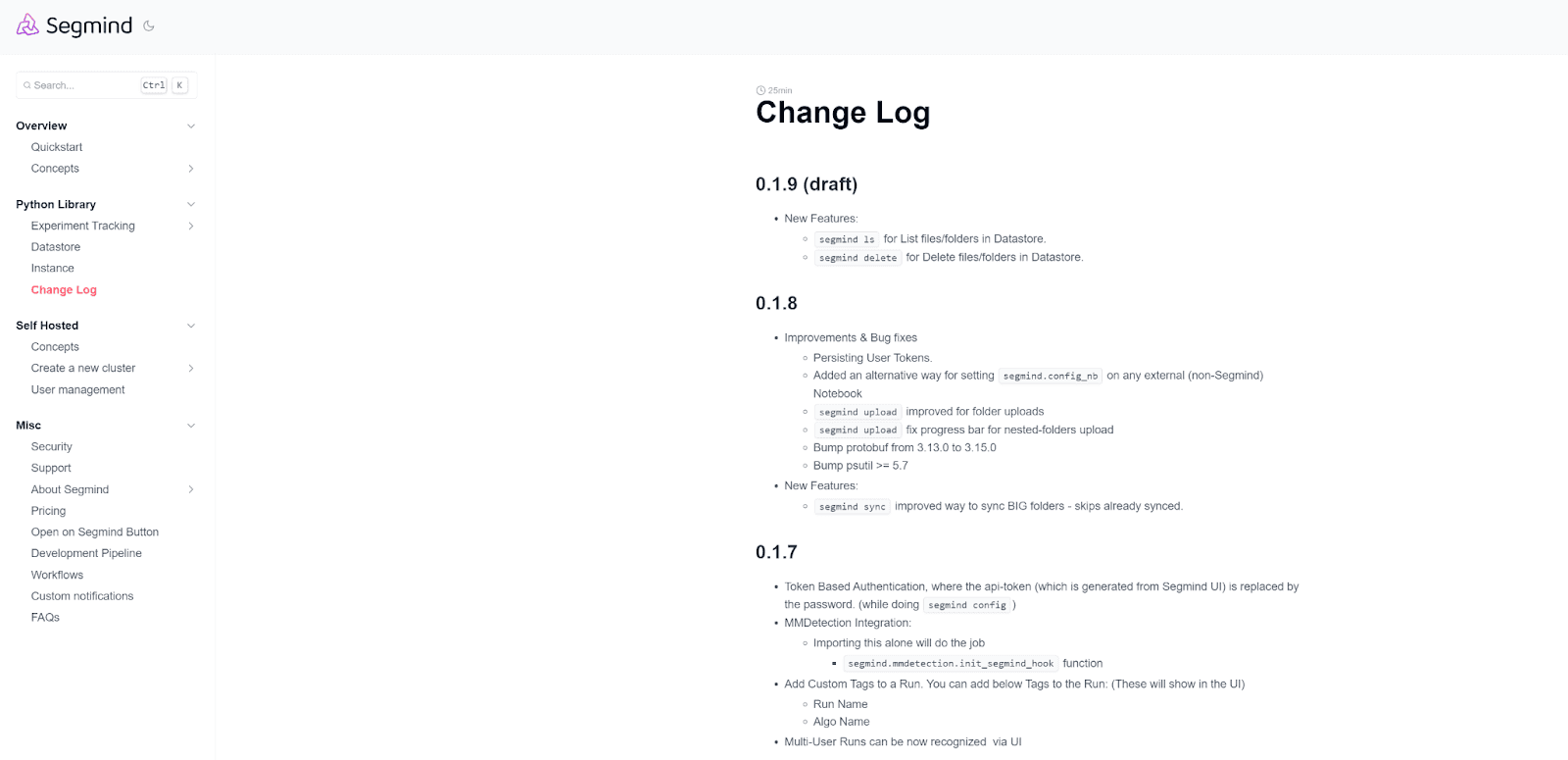 For example, Segmind has placed its changelog within its Python Library section, which makes sense because this resource is of great use to developer users of the product who need to keep track of bugs and changes to the code.