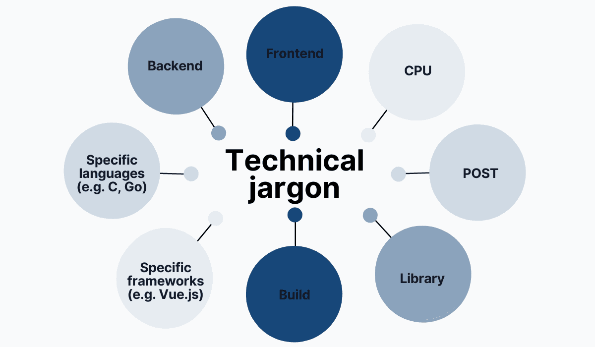 It’s unlikely that anyone outside of Development will understand any of the above terms, especially concerning specific languages and frameworks.