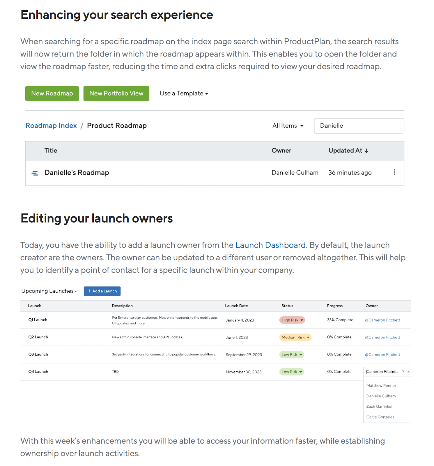 Furthermore, ProductPlan also spells out the benefits these new functions bring. The first feature reduces time and clicks, whereas the second helps identify points of contact.