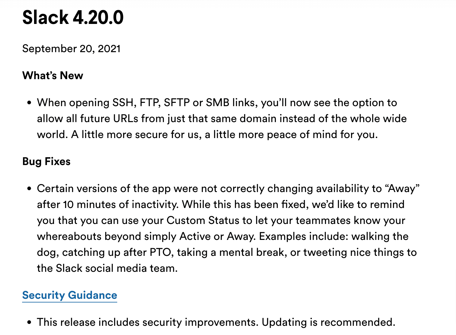 The text is divided into three distinct sections: What’s New, Bug Fixes, and Security Guidance.