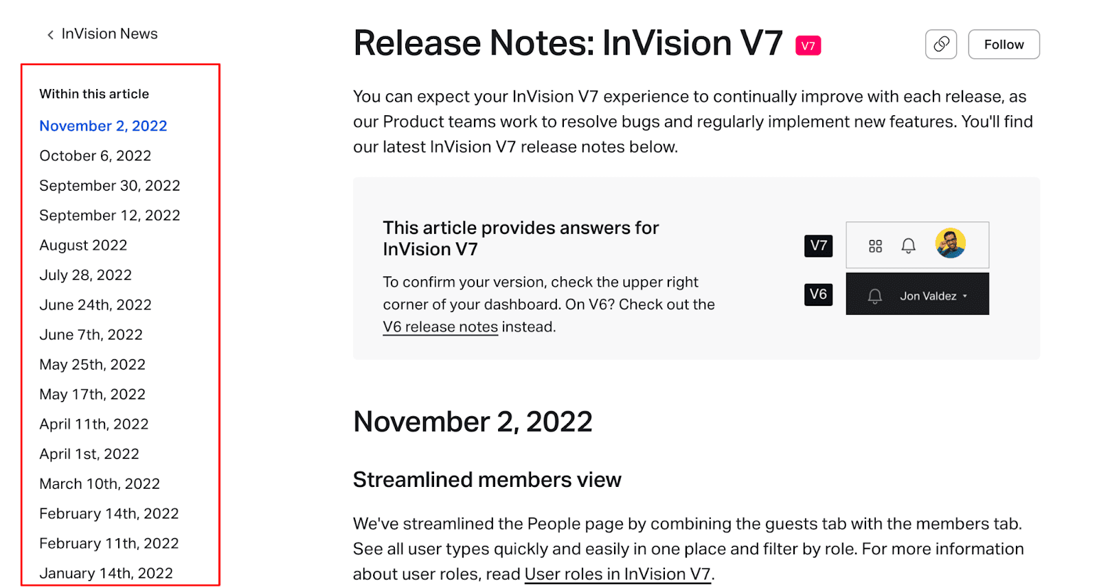 With this synopsis, users can easily traverse all of InVision’s most recent release notes and examine their latest changes.
