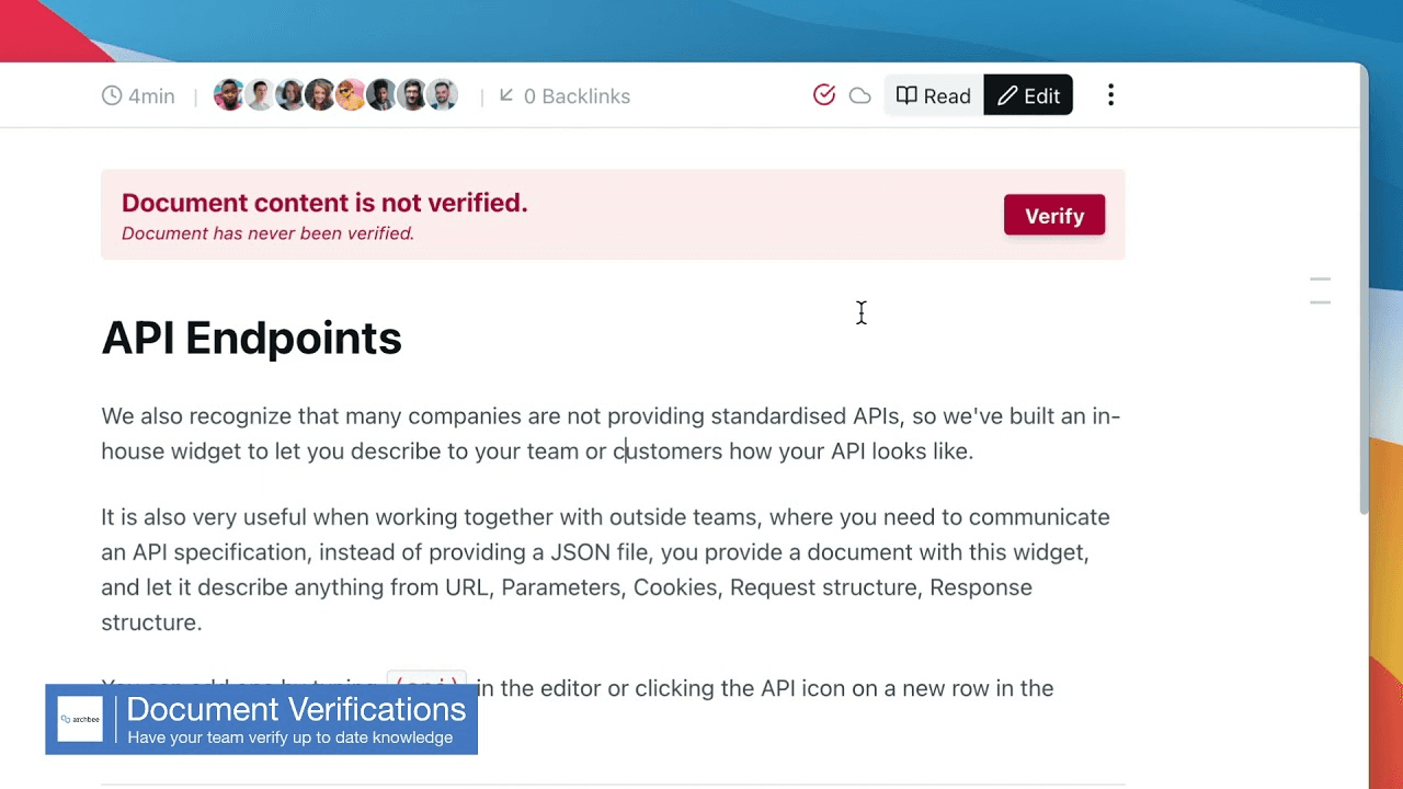 Some documentation software, Archbee included, has features that enable stakeholders in the project to mark a document verified and up to date, which makes it very unlikely that you’ll be using the wrong version.