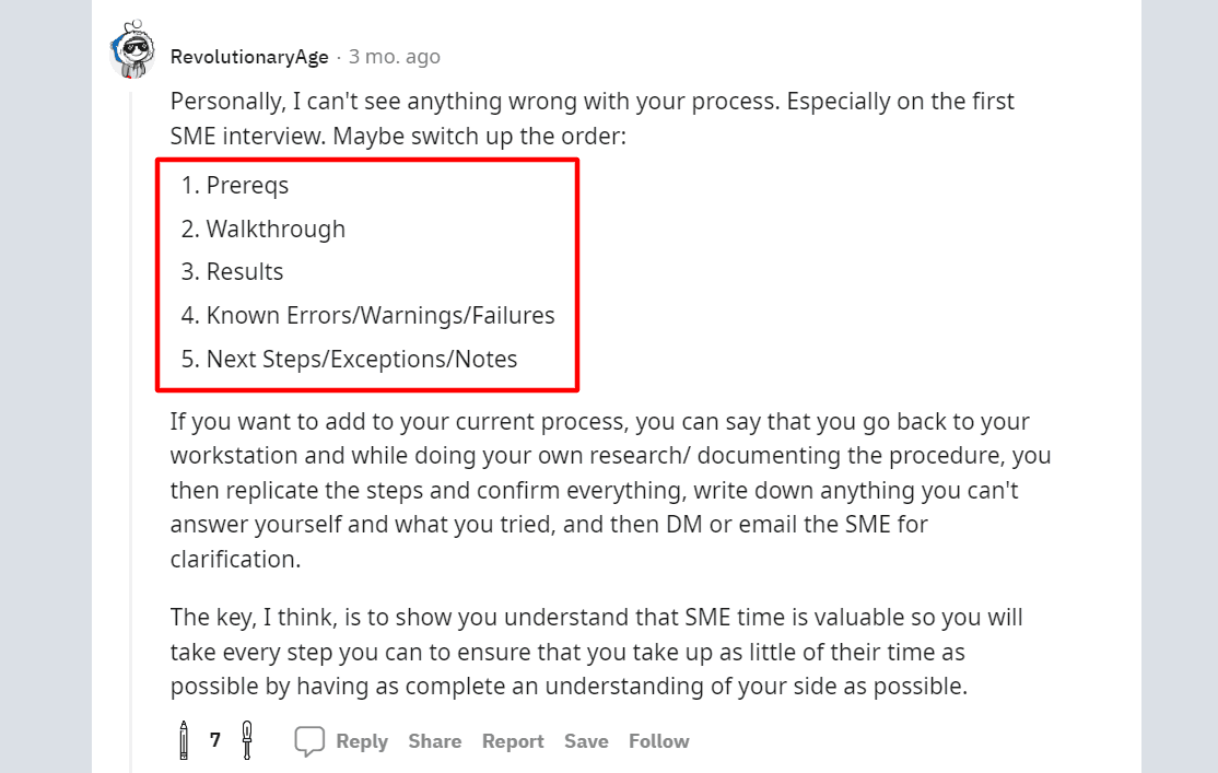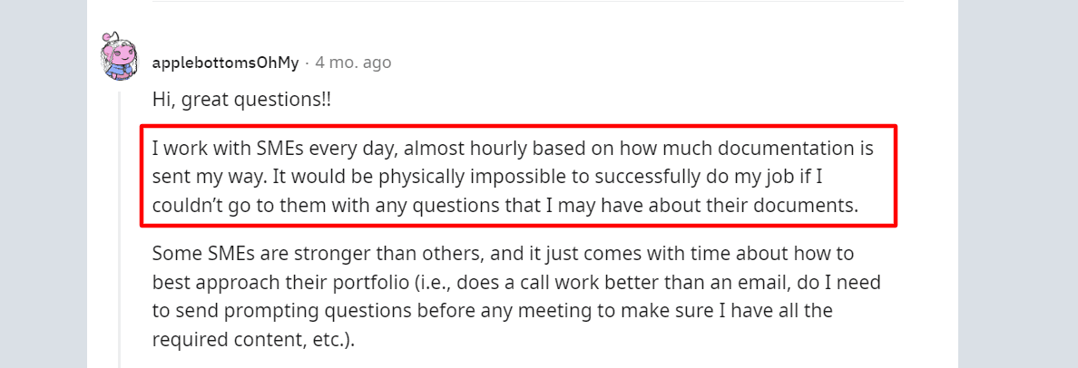 The key to a good SME interview is preparation. By the time you’re consulting SMEs, you should already have some first-hand experience with the product and some knowledge from other available resources.