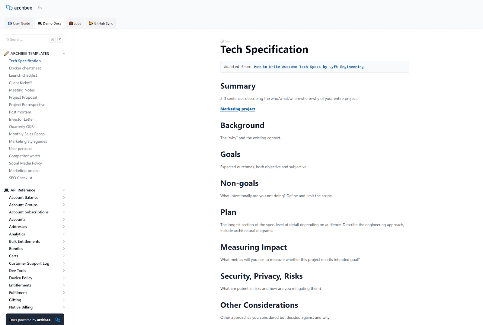 For example, here’s a template for tech specifications created using Archbee: