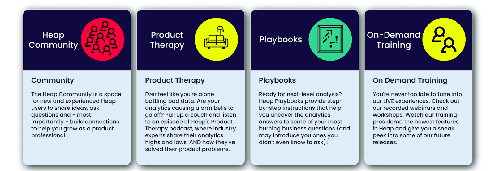 Even that isn’t all. Heap also provides other forms of education like live training, podcasts, step-by-step playbooks, and a community for users to learn from each other.