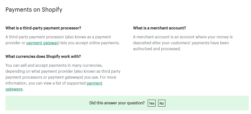 It might not contain every piece of information that exists about Shopify, but it answers the most common questions about getting started with the platform, selling, payments, and shipping.