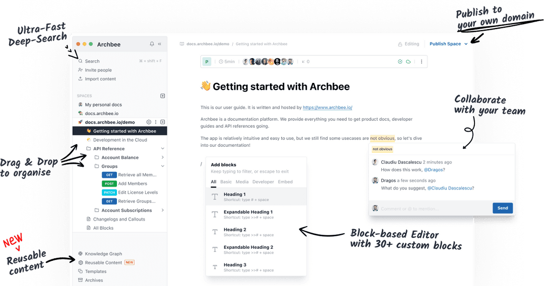 Archbee is a product documentation platform with dozens of features tailored to creating, maintaining, and publishing educational resources for your customers.