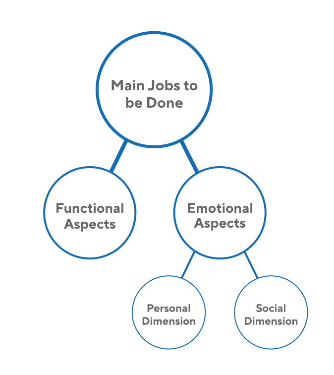 This image incorporates the jobs-to-be-done framework, an approach that paints customers’ goals (needs) as jobs. As you can see, the ‘job’ the customer wants to be done depends on both functional and emotional aspects.