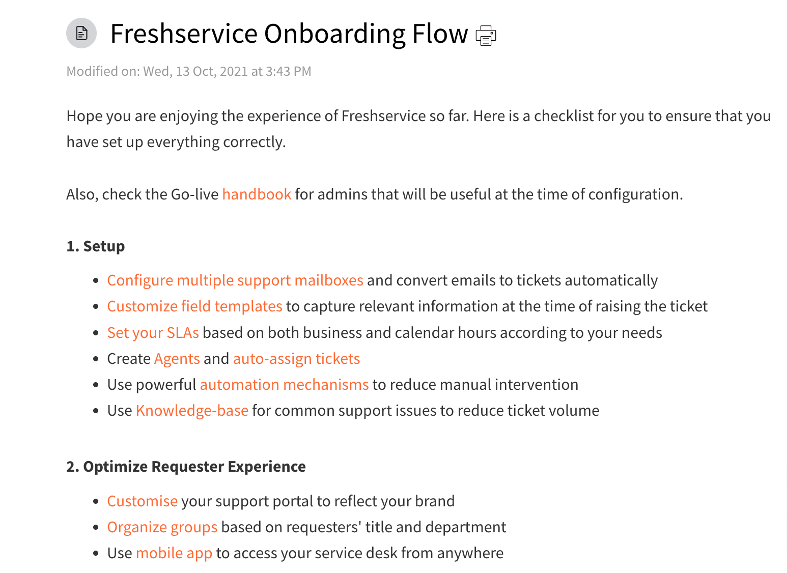 Freshservice, an IT Service Management solution, has compiled a document dedicated purely to onboarding—a checklist for users to ensure they have completed all the onboarding steps.