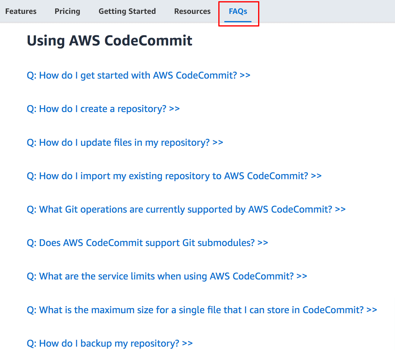 If a new AWS CodeCommit user glanced at this FAQ, they would immediately find out everything the software was capable and incapable of doing.