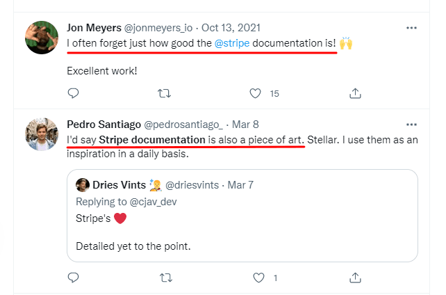 For example, Stripe is famous for its excellent documentation that makes using this complex product a breeze, which is evident from the amount of praise Stripe’s documentation gets online.