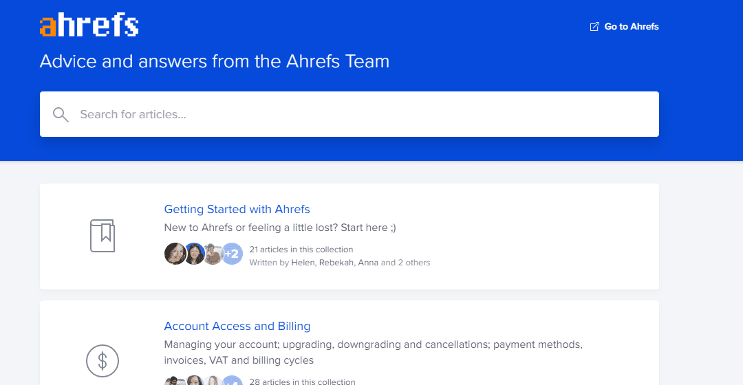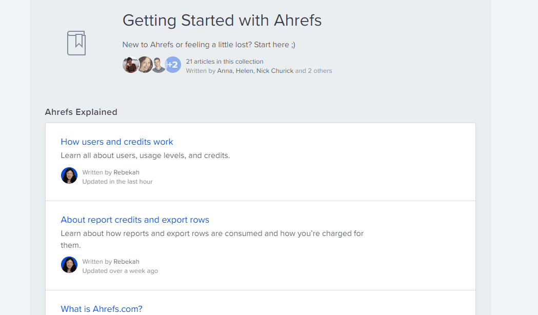 The first collection features a getting started guide, which is smart because many users will access the knowledge base to find precisely this information when they’re first starting to work with Ahrefs.