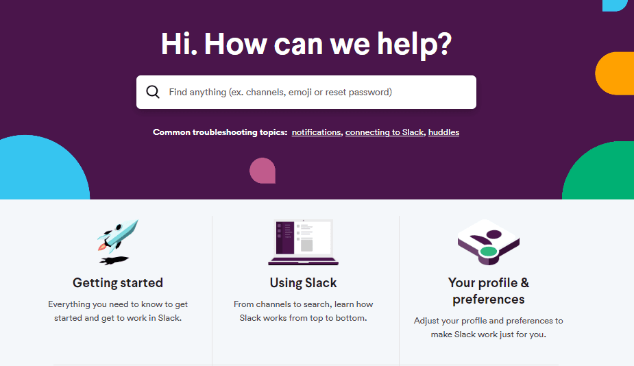 The ubiquitous communication app Slack leverages its recognizable visual identity to make its user documentation engaging and even fun to use.