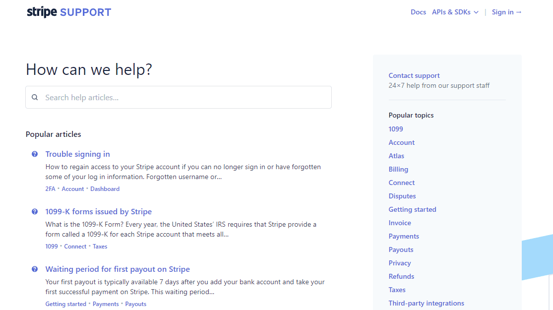 It’s a link for contacting Stripe’s 24/7 customer support staff, which is another example of combining self-service and agent-based support to ensure that no customer issue goes unsolved, a great practice to follow.