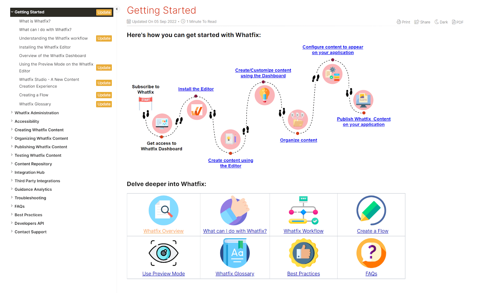 Since Whatfix is a digital adoption platform that aims to simplify all kinds of digital experiences, it’s hardly surprising that its user documentation is outstandingly interactive, diverse, and multi-format.