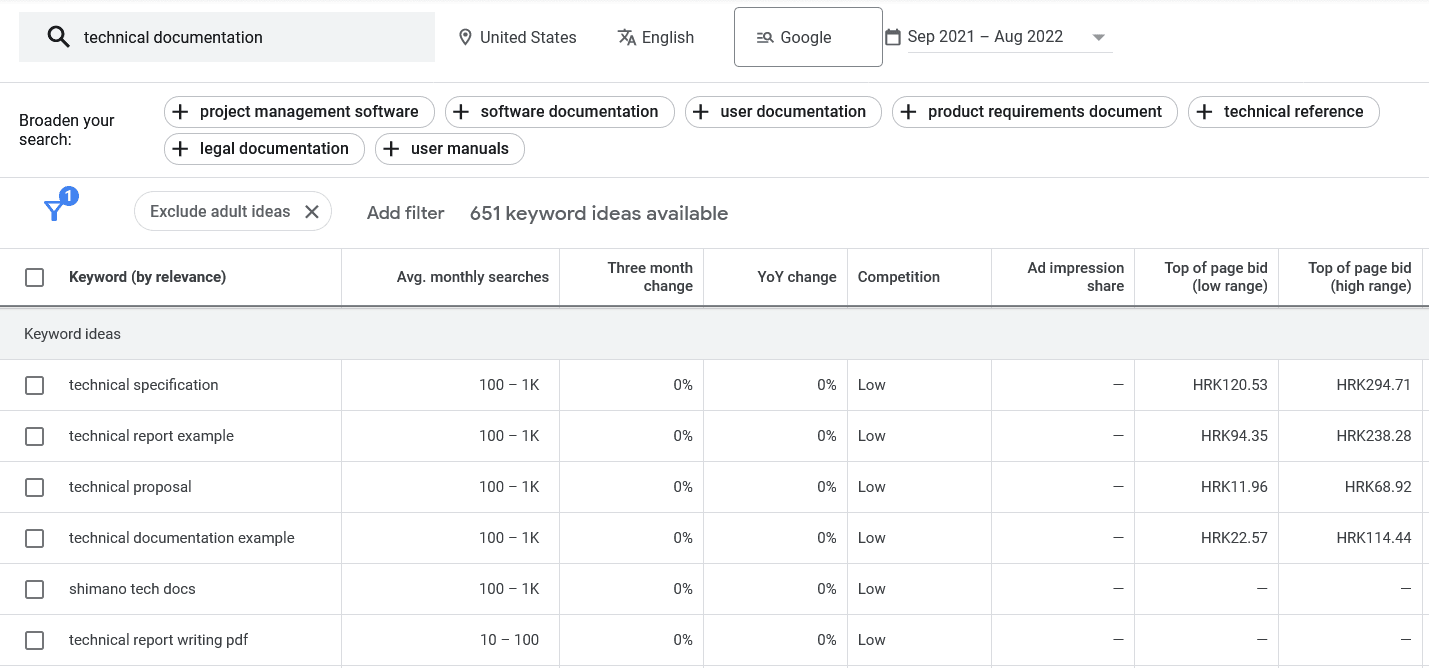 It can show you average monthly searches for your keywords and their alternatives, how competitive they are, and other useful metrics which you can use to make your documentation more visible online.