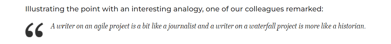 In that vein, one technical writer at TWi, a tech writing company, has compared documenting Agile projects to being a journalist.
