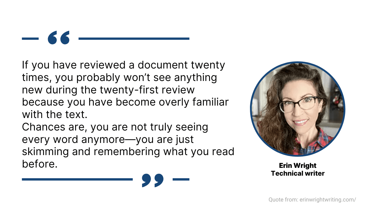 Wright suggests that one of the ways to overcome the issue is by getting a fresh pair of eyes from coworkers or freelance editors.