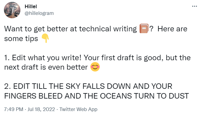 Of course, spending too much time editing doesn’t necessarily mean delivering a better document, which is why you also need to know when to stop, or you’ll end up like this anguished tech writer from Twitter.