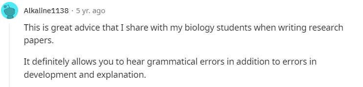 Reading out loud will also allow you to identify logical errors or incomplete explanations. For instance, this Redditor uses the practice when writing and editing research papers and advises their students to follow the same approach.