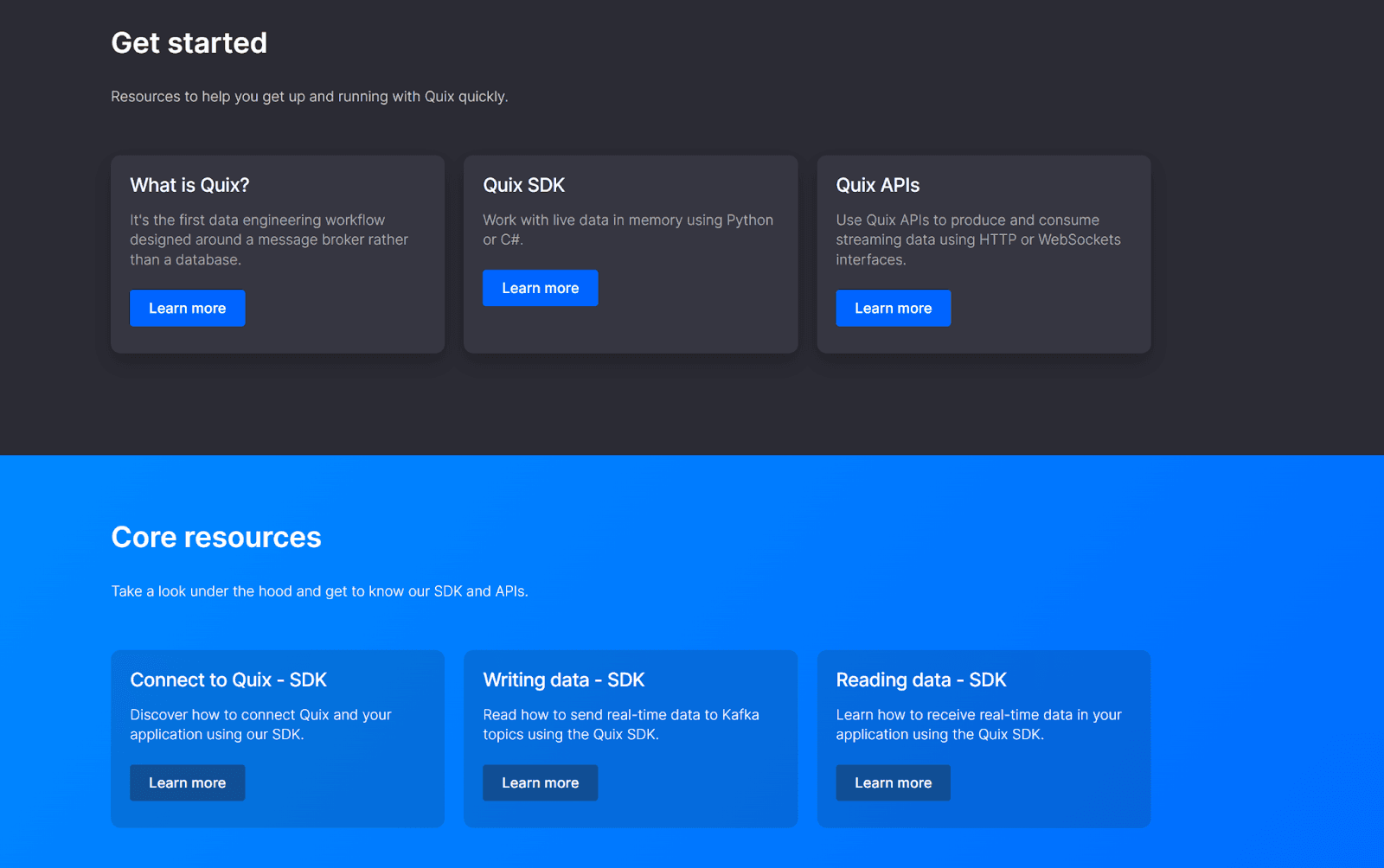 Quix offers a complex product which is supported by a large archive of documentation, including user guides, a large glossary of terms, tutorials, troubleshooting guides, API and SDK documentation.