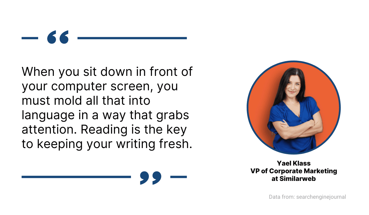 For starters, one of the habits of great writers is that they read a lot. As Yael Klass, Vice President of Corporate Marketing at Similarweb, points out, reading is crucial for keeping your writing ability sharp.