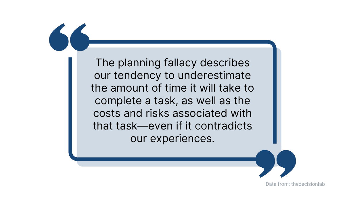 A part of organizing your work well is ensuring that you stick to deadlines. To do that, you should avoid the planning fallacy, a cognitive bias that causes you to miss deadlines.