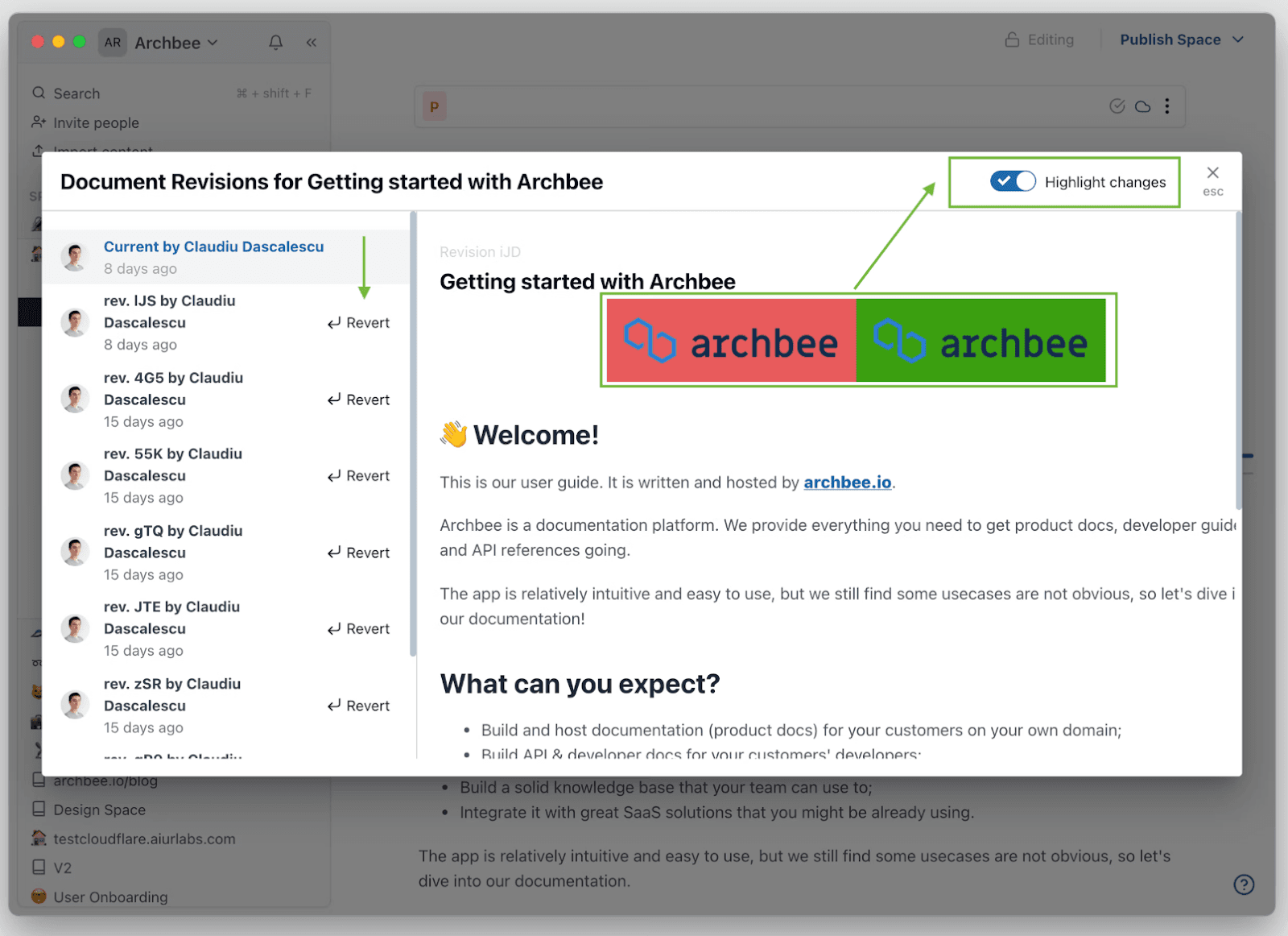 With Archbee, technical writers can browse the document version history and update their own technical documentation so that it reflects the alterations to the product.