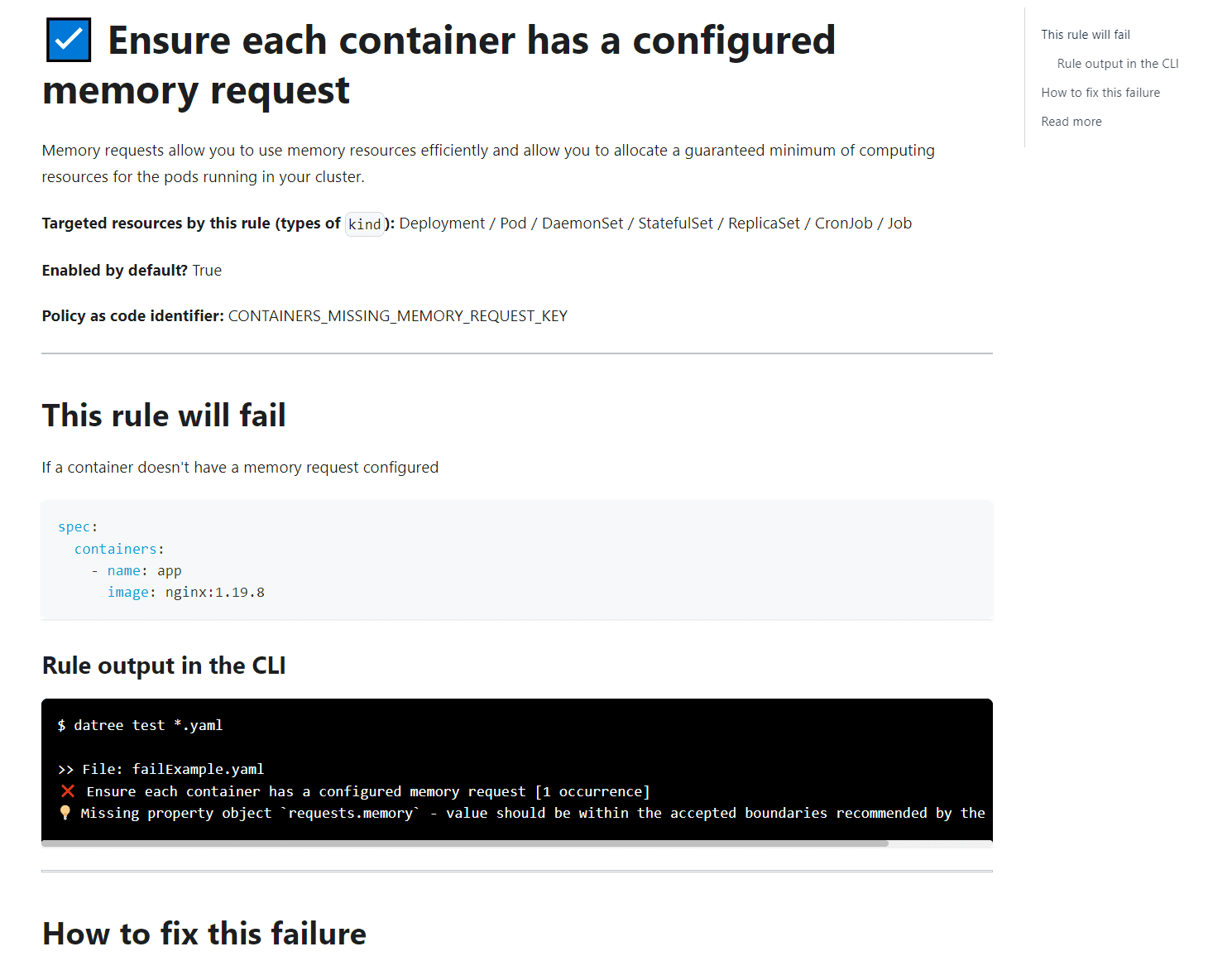 Datree, a CLI tool, has well-organized documentation that always follows the same structure. Let’s take a look at an overview of their built-in rules.