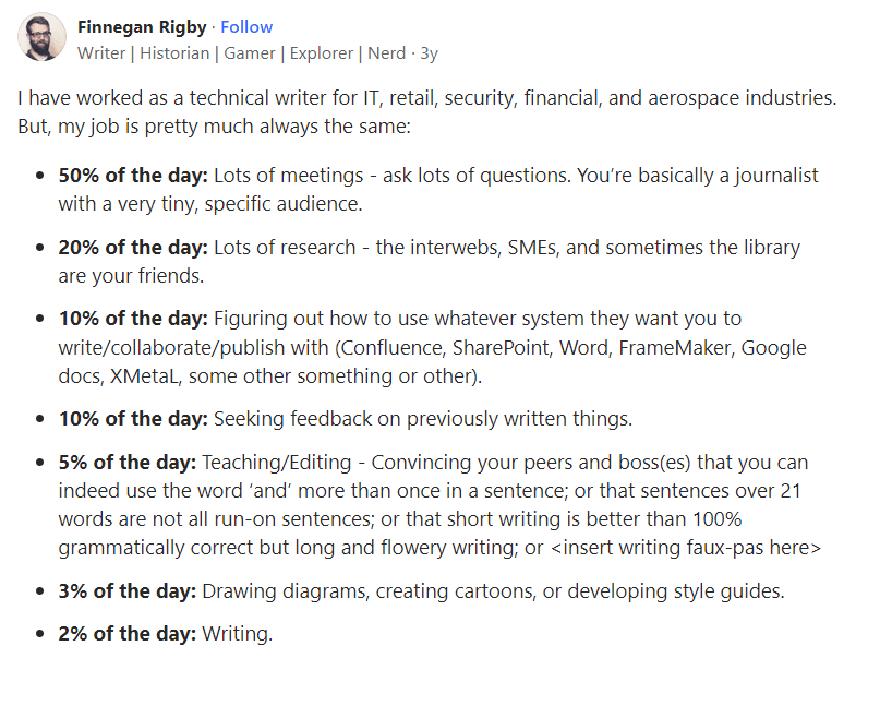 According to technical writer Finnegan Rigby, meetings, SME interviews, and creating visual elements are just some of the activities in a tech writer’s day, and that’s without factoring writing in.