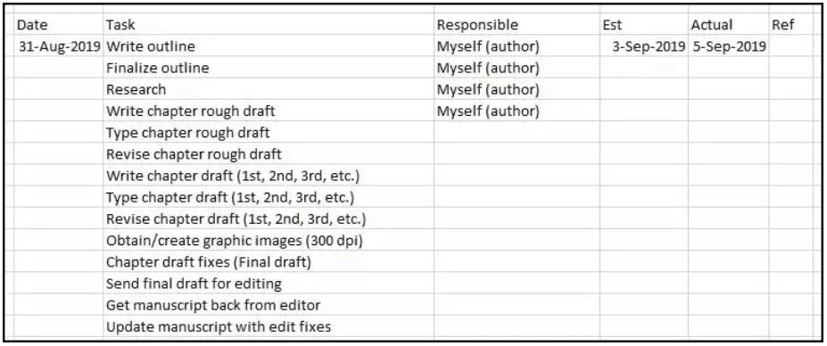 For instance, the writing schedule designed by tech writer Colin Dunbar defines exactly when the author will create the draft for each chapter.